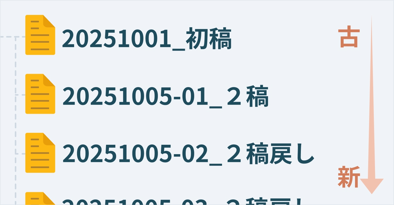 デザイン作成など過去バージョンを残しておきたいような資料の場合、頭に年月日を付与すると最新ファイルがわかりやすくおすすめです。