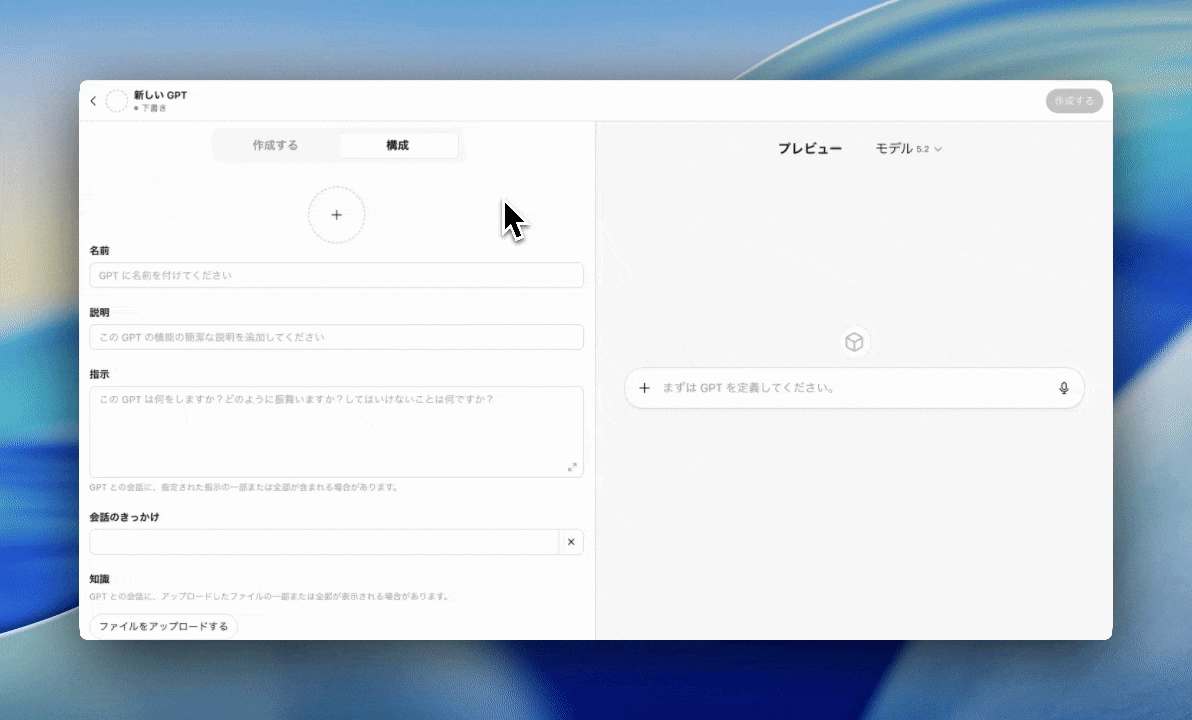 - 構成に入力をして一から作る:自分で名前や指示などを入れて作っていく方法