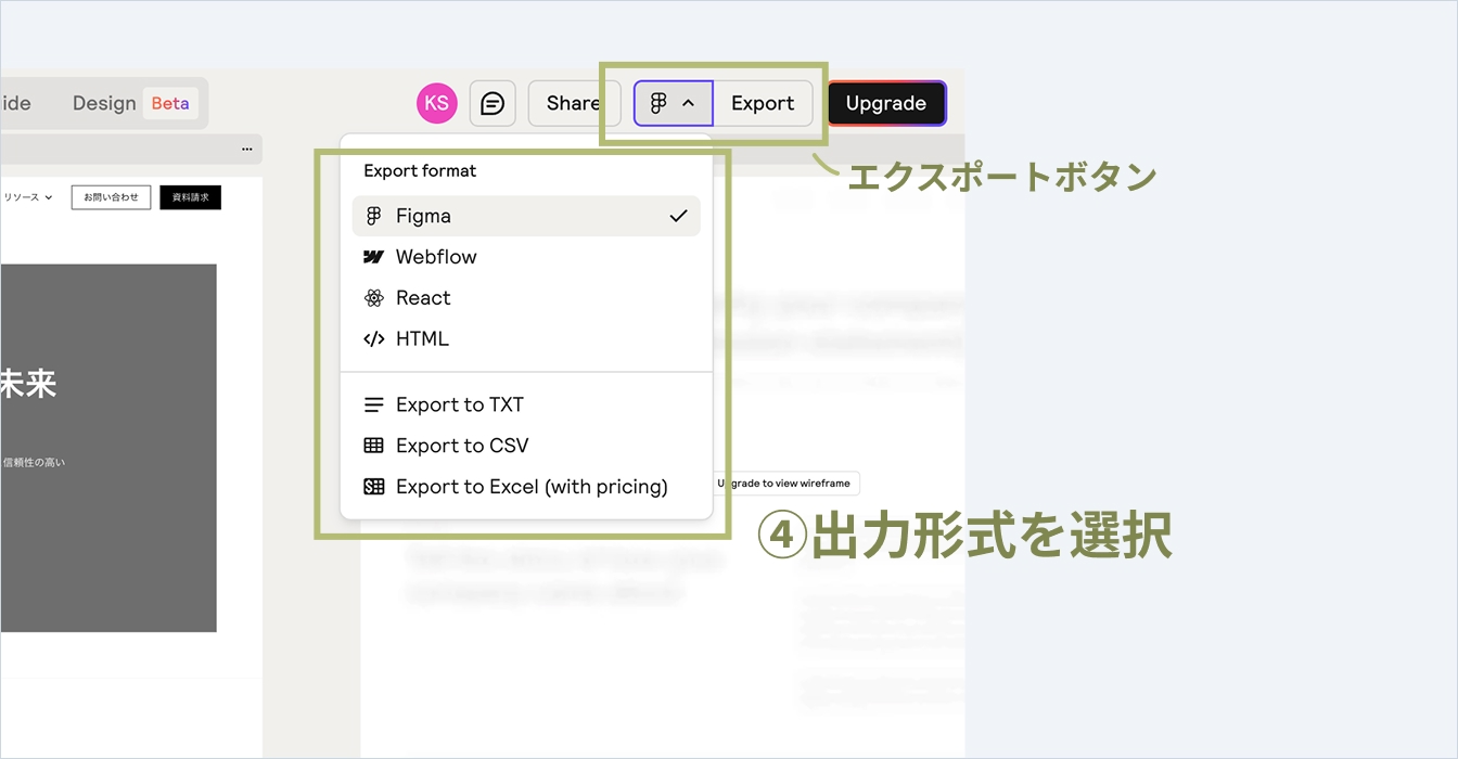 さらに、作成した構成はそのまま編集でき、FigmaやWebflow、React向けにエクスポートも可能です。