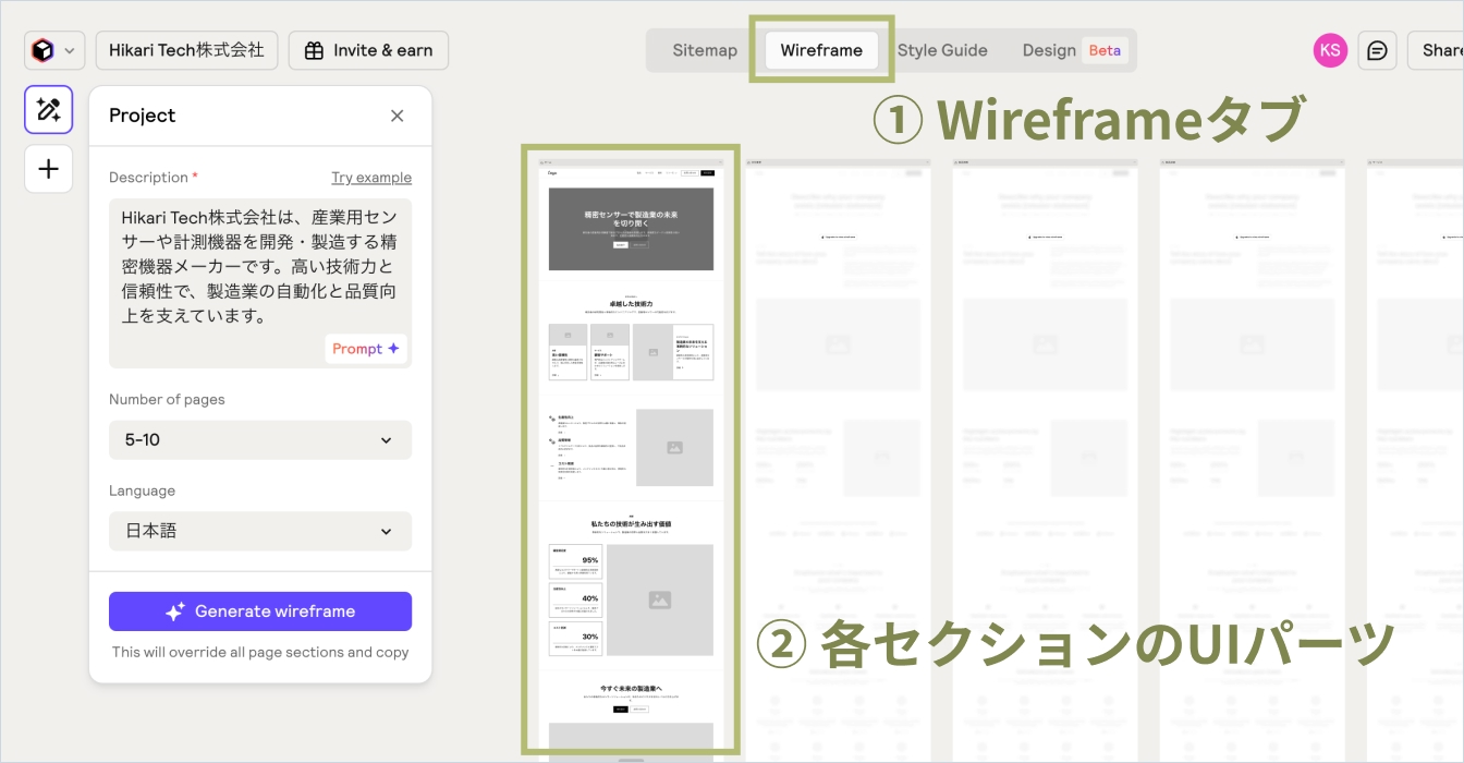 ① 生成された構成が整ったら、「Wireframe」タブをクリックするとワイヤーフレームの生成が開始します。