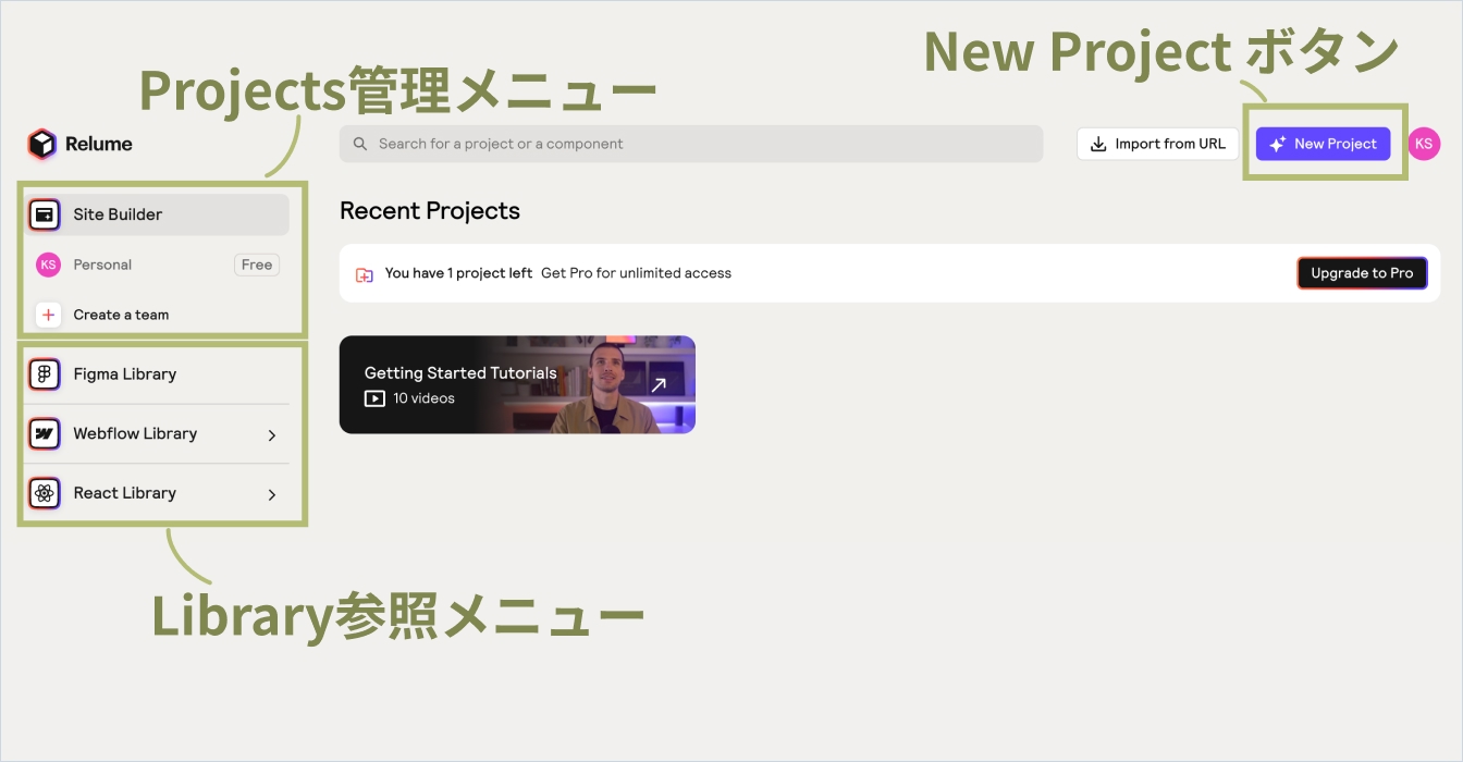 3. ログイン後のダッシュボード画面にて「Projects」「Library」などのワークスペース構成を確認できます。