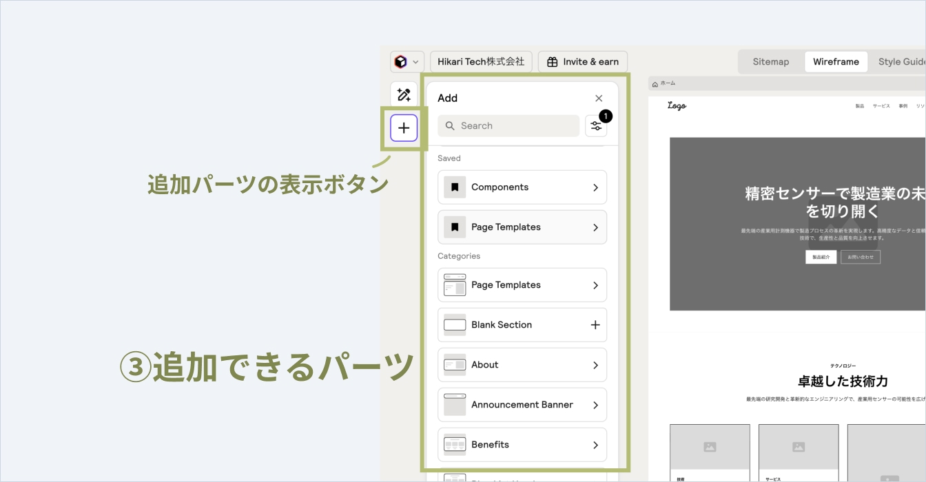 ③ 要素が不足している場合、Relumeで用意しているたくさんのパーツの中から追加したい要素を選んで追加することができます。